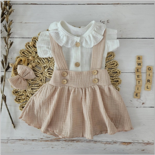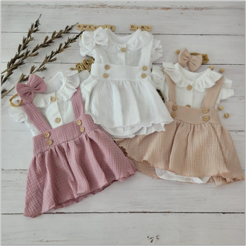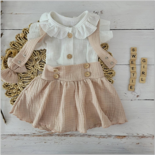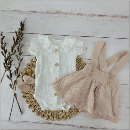 Mušelínová suknička s lacnom, bodýčko a čelenka, 3D sada, biela/béžová, veľ. 62