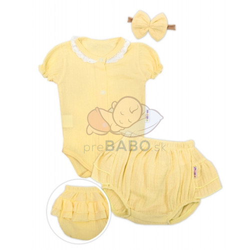 Baby Nellys 3-dielna mušelínová súpravička, body, kraťasky+čelenka GIRL, žltá, veľ. 68
