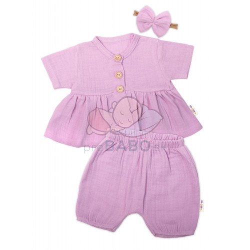 Baby Nellys 3-dielna mušelínová súpravička, tunika/blúzka, kraťasky, čelenka, lila