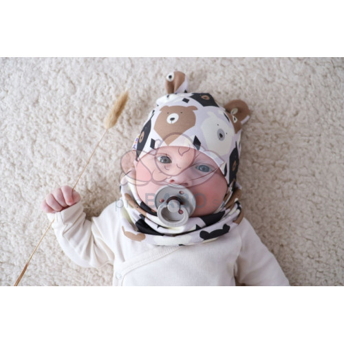 Baby Nellys Dvojvrstvová čiapka s uškami + komínček Medvede, hnedá/smotanová, veľ. 80/92