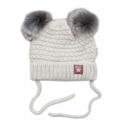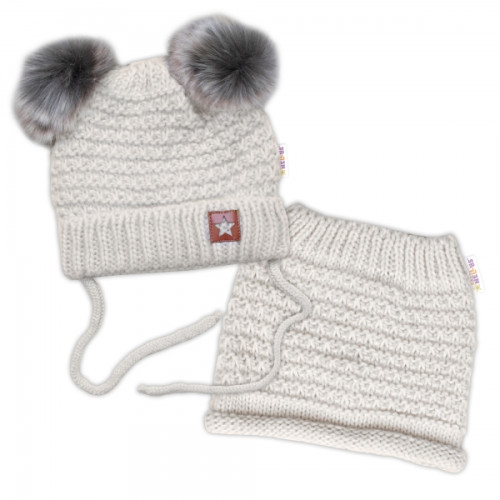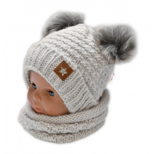 Zimná pletená čiapka Star s fleecom a chlpáčkové brmbolce + komínček 2D sada, béžový melír
