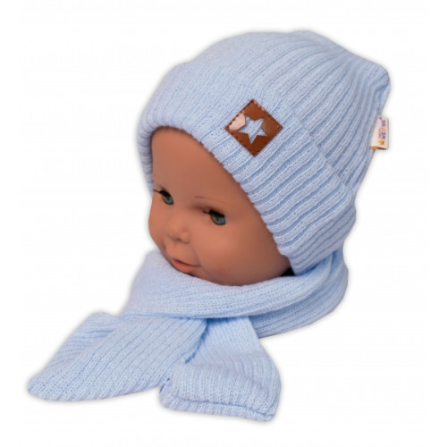 Baby Nellys Pletená čiapka so šálom a rukavičky 3v1, STAR - sv. modrá, 68/74