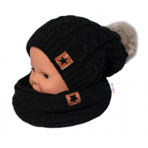 BABY NELLYS Zimná dvojvrstvová čiapka s brmbolcom + komínček Star, čierna