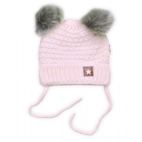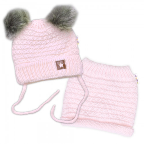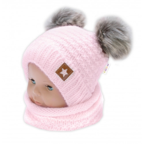 Zimná pletená čiapka Star s fleecom a chlpáčkové brmbolce + komínček 2D sada, ružová
