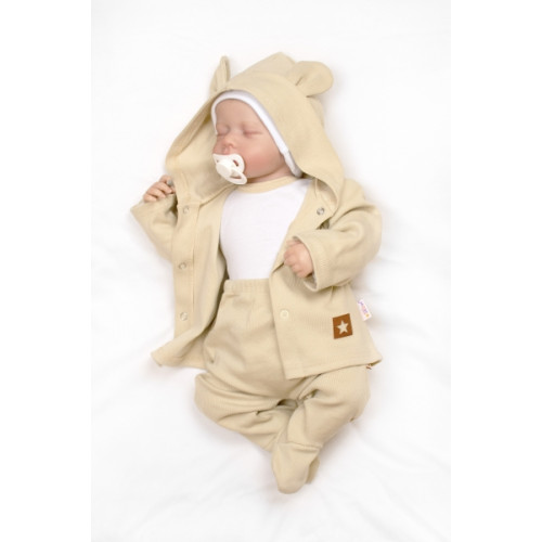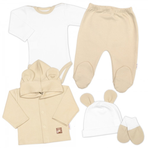Rebrovaná sada, Star 5D, body, polodupačky, kabátik, čiapka, rukavice - béžová, biela, 68