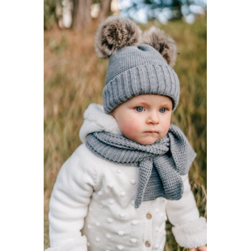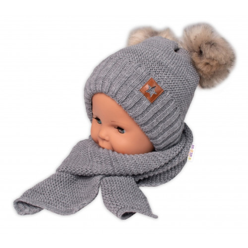 Zimná čiapka s kožušinovými brmbolcami + šál Baby Nellys Star - sivá, 6/24 mesiacov